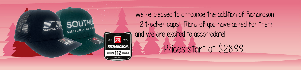 While railroad items are what we have come to be known for, we also have embroidered hats with farm and tractor logos, mining & oilfield jobs, school buses and more.