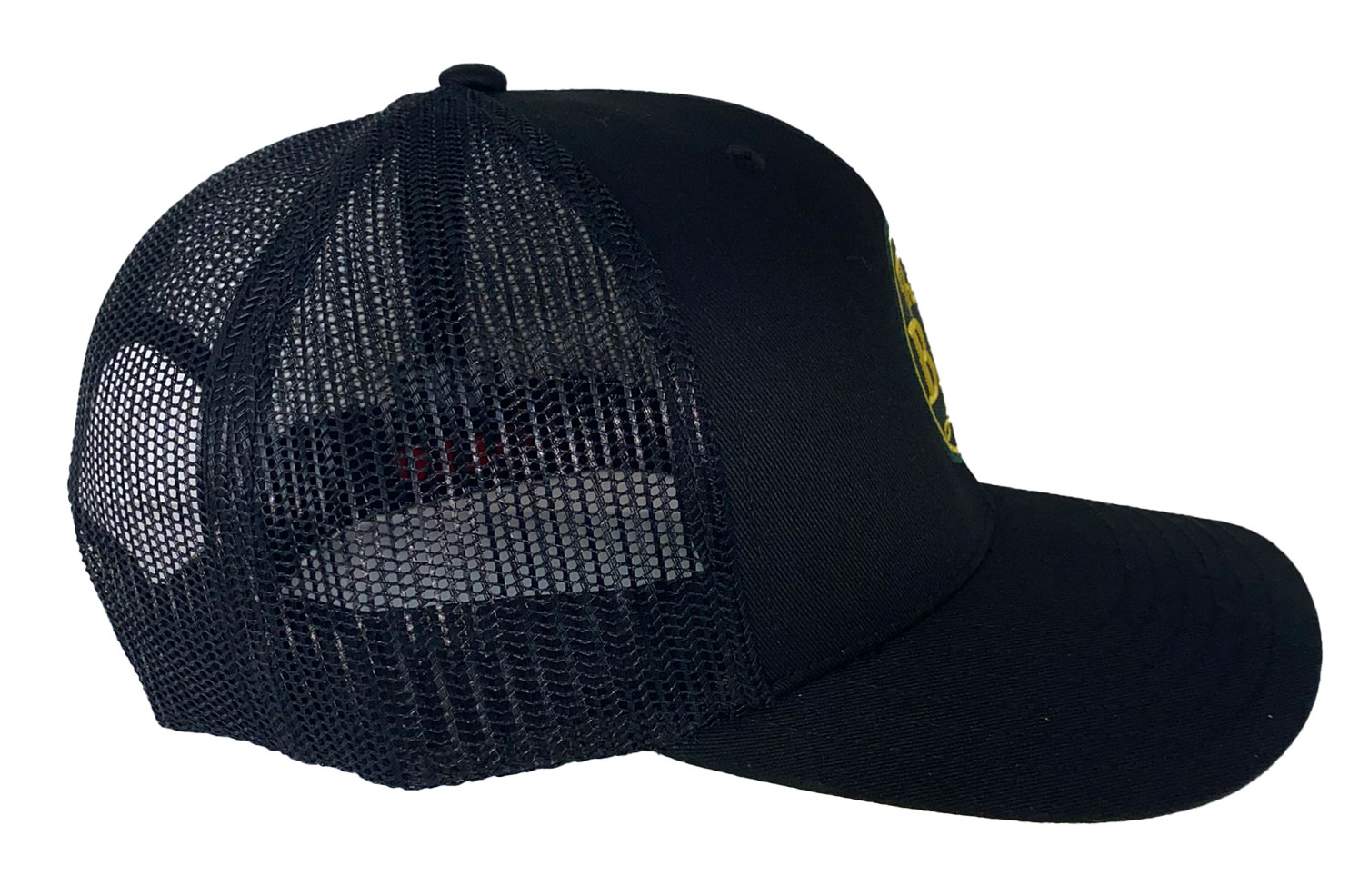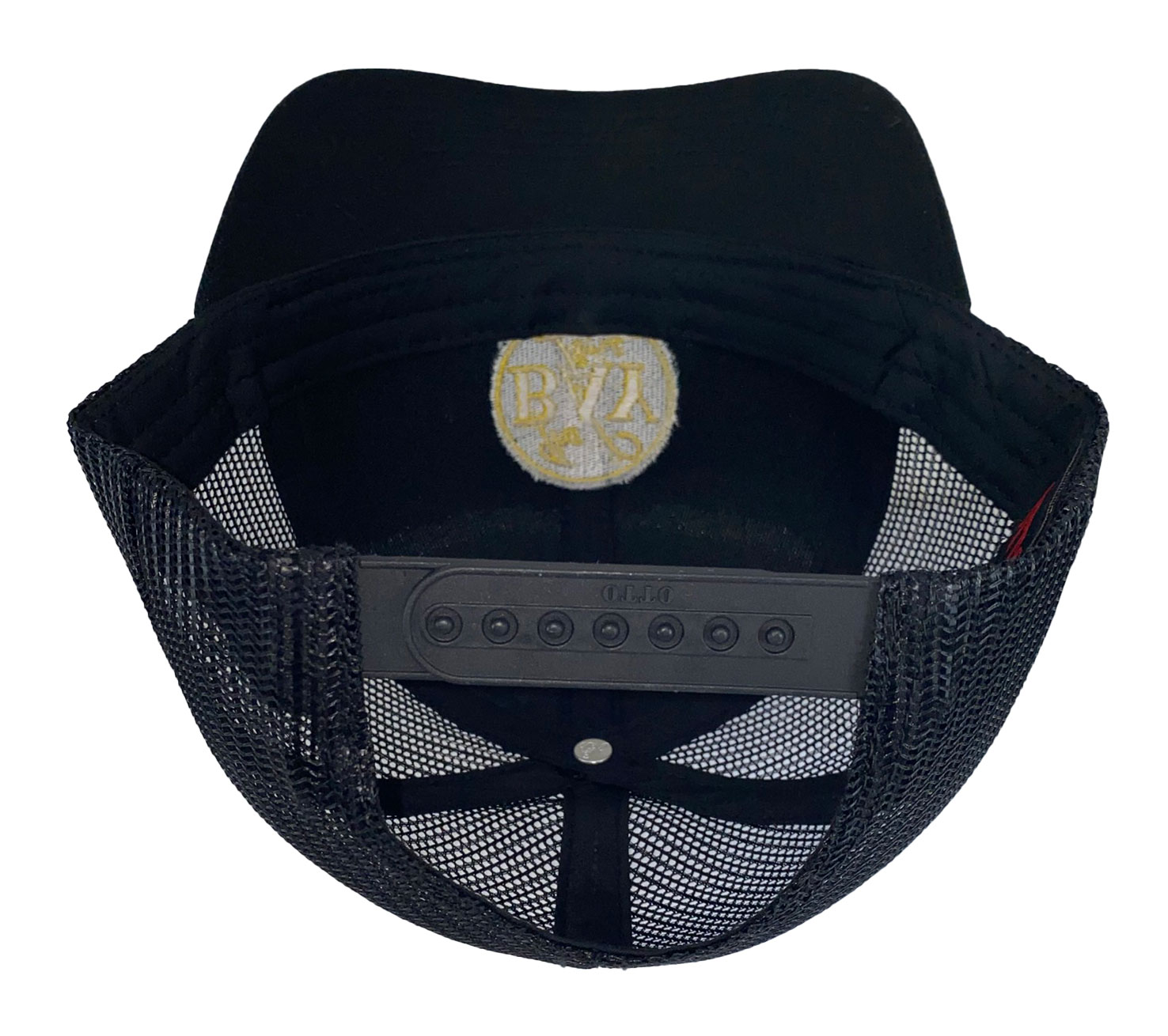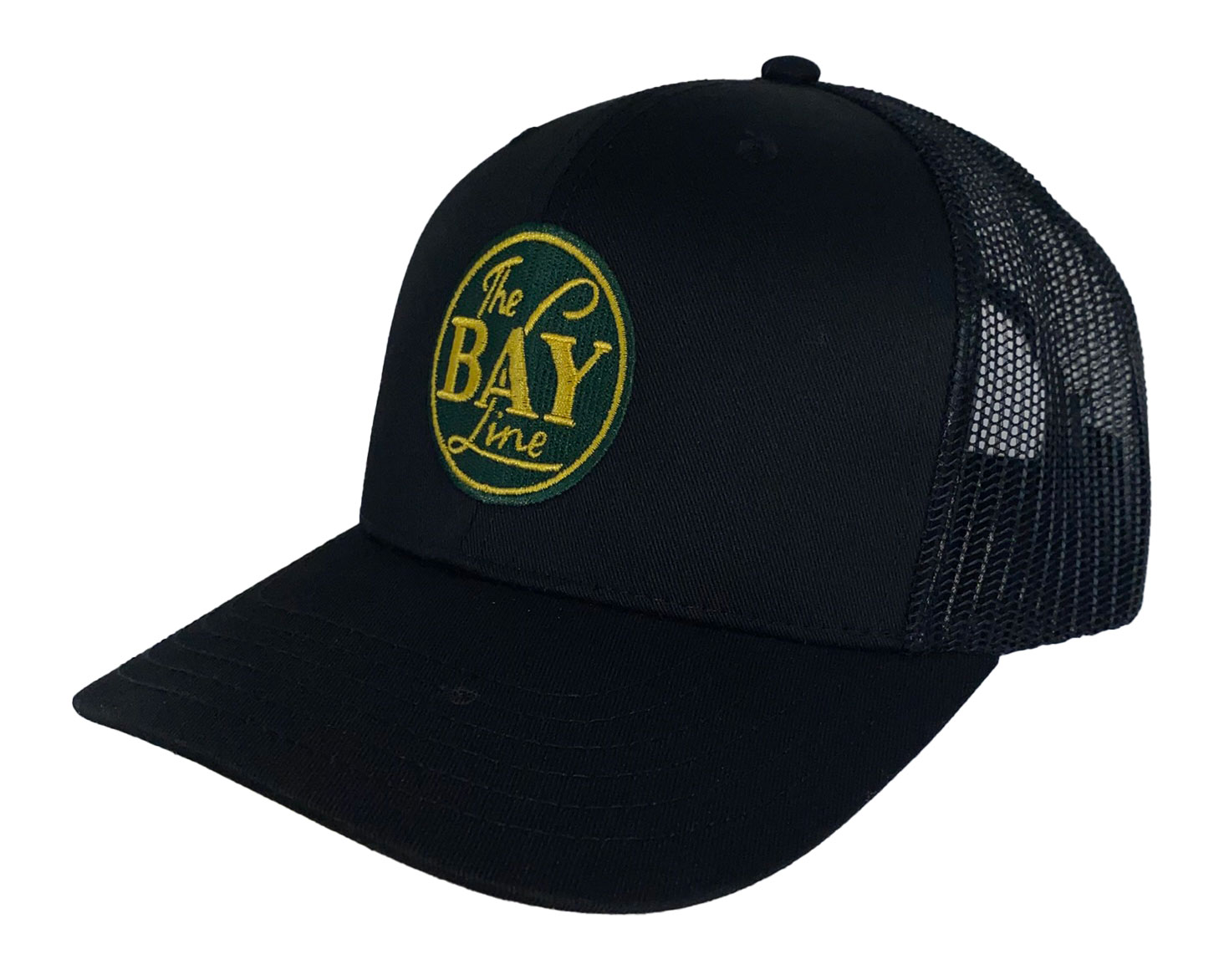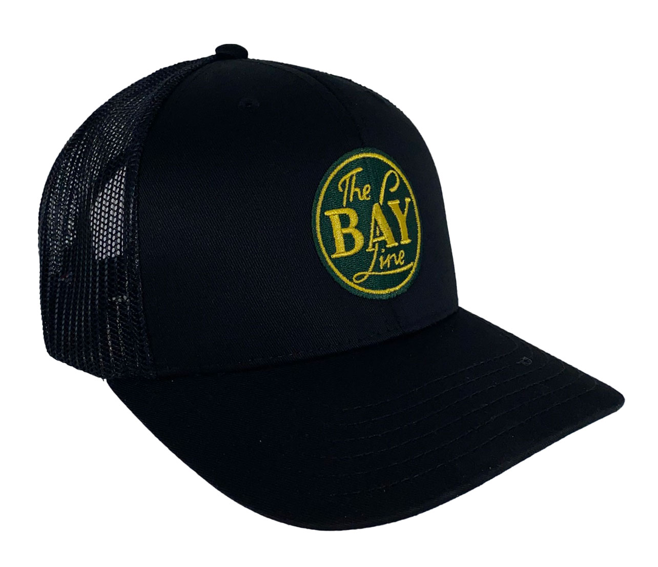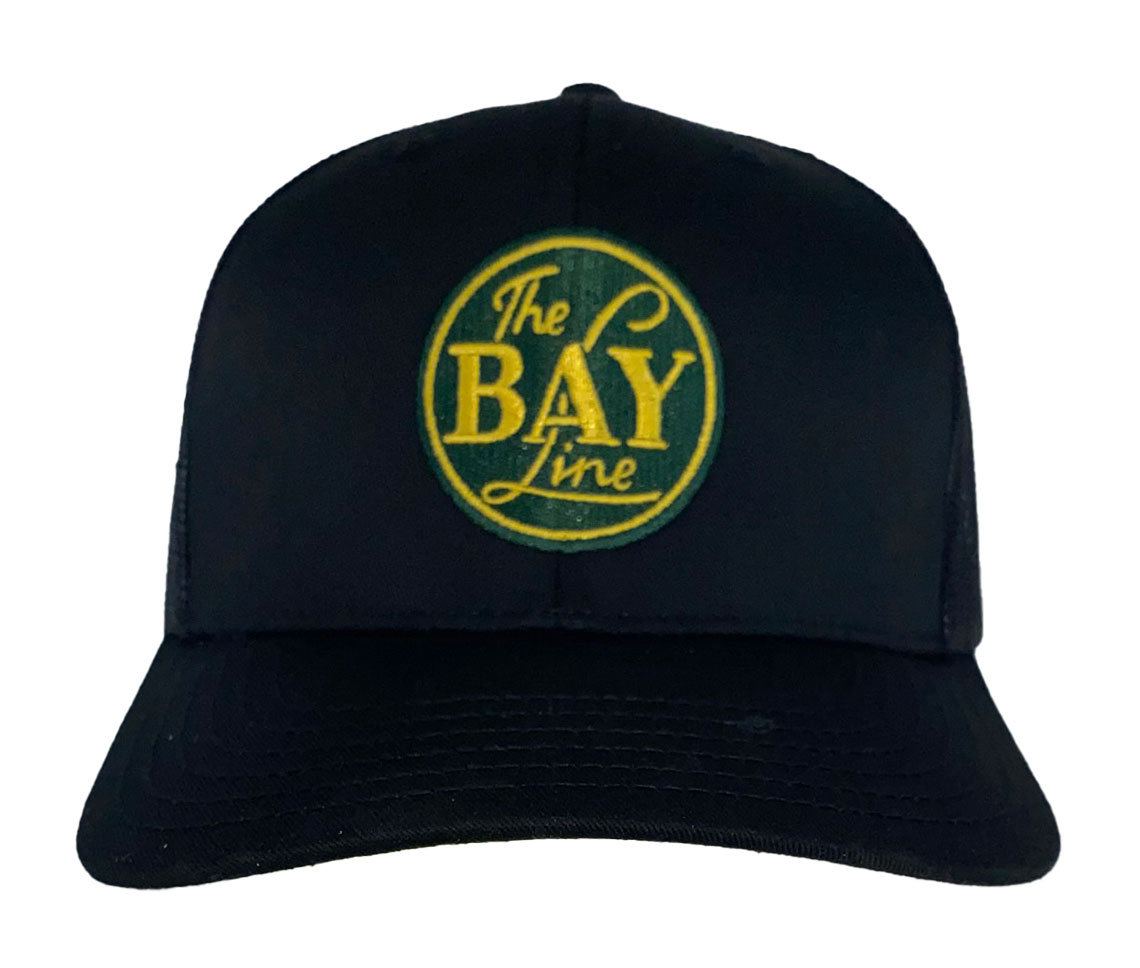 This is a brand new black cotton twill cap with mesh back and adjustable snap band. Cap features the The Bay Line logo.  Cap features high quality direct embroidered logo.  This is not a patch applique.