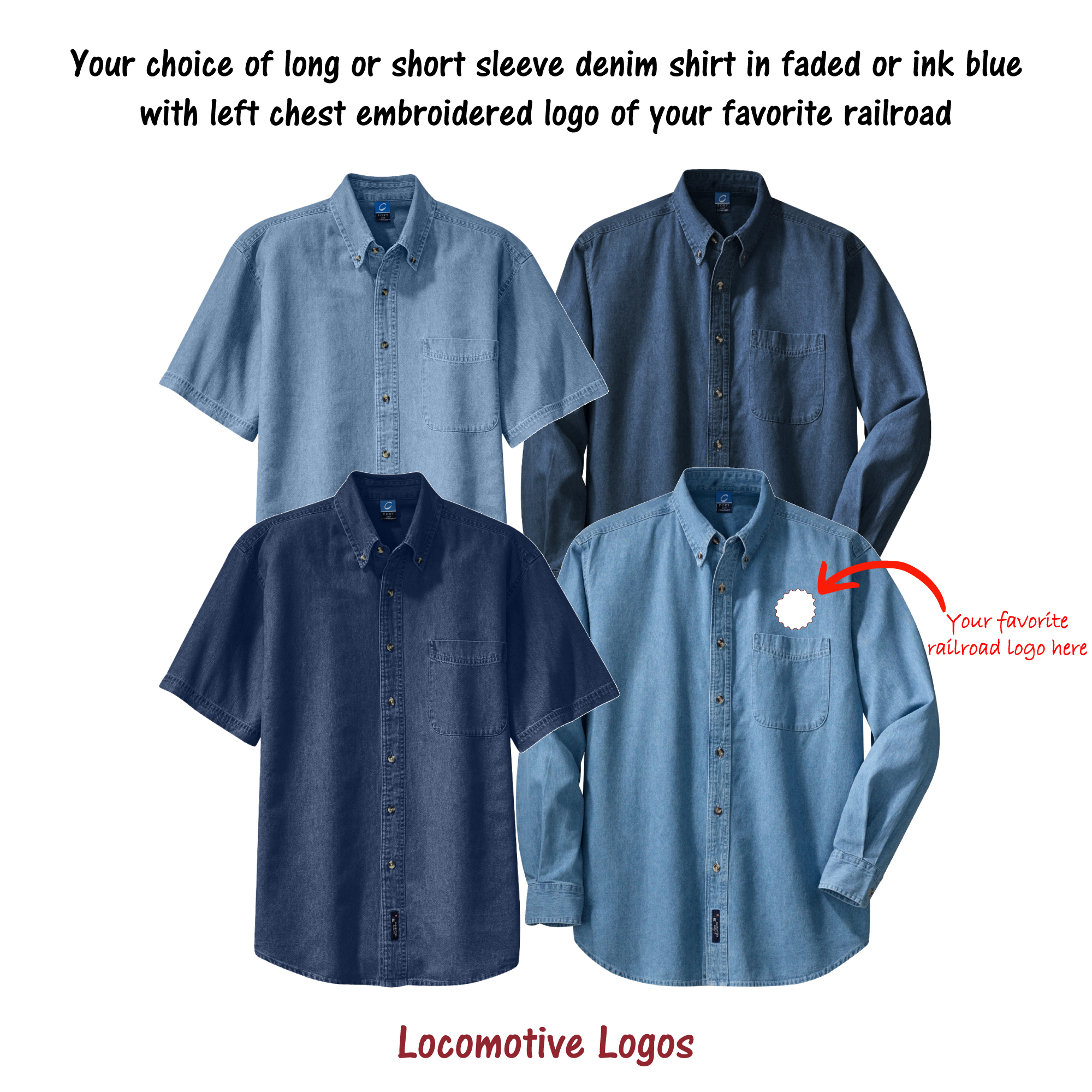 Our denim shirts are embroidered with your choice of logo.  Logo will be embroidered above left pocket as shown in photos. Shirts are short sleeve and come in your choice of color.