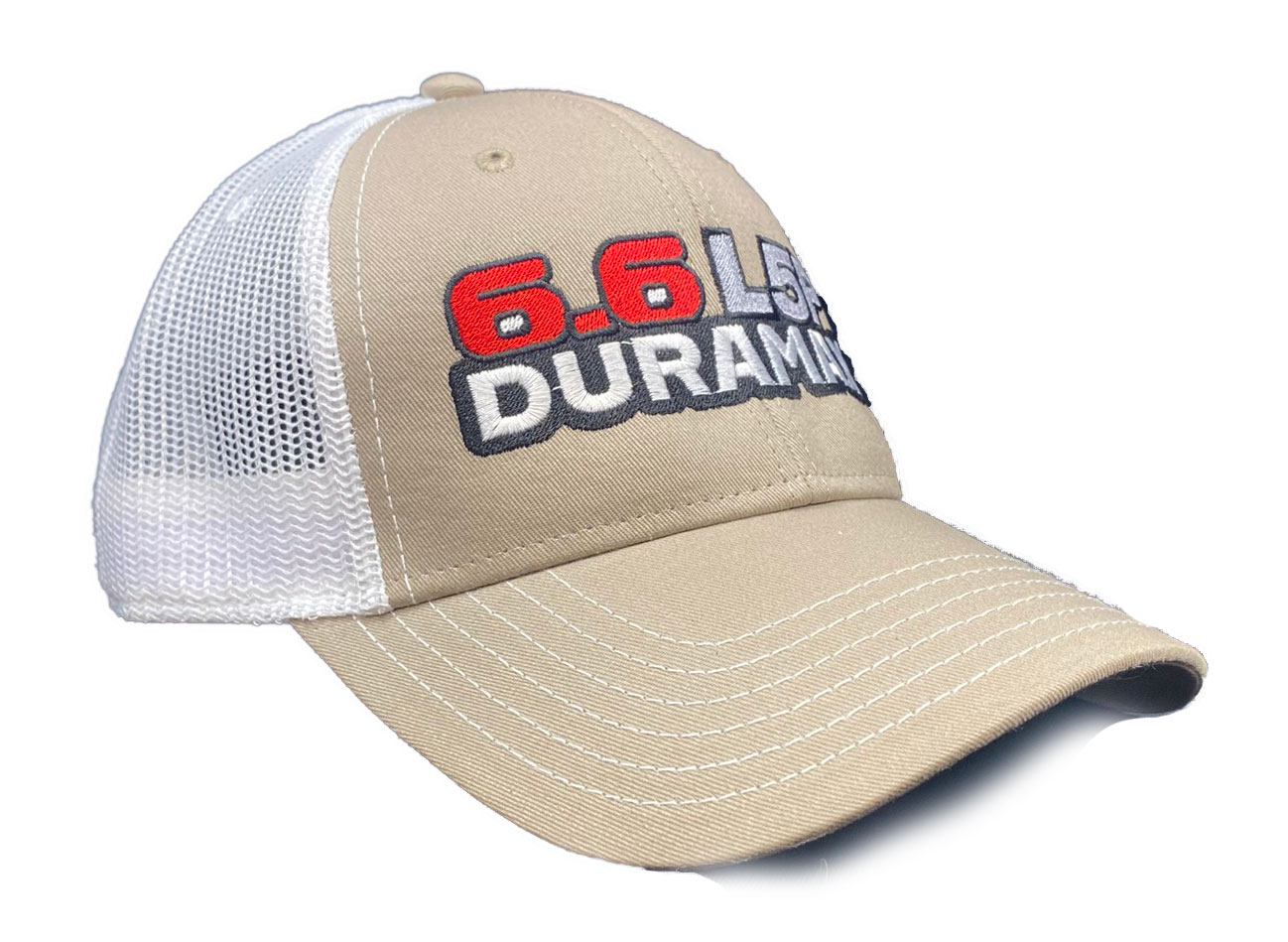This is a brand new cotton twill low fitting cap with mesh back and adjustable snap band.  Caps is embroidered with 6.6 L5P Duramax.  Cap features high quality direct embroidered logo.  This is not a patch applique. Choose cap color. Other engine choices are available.