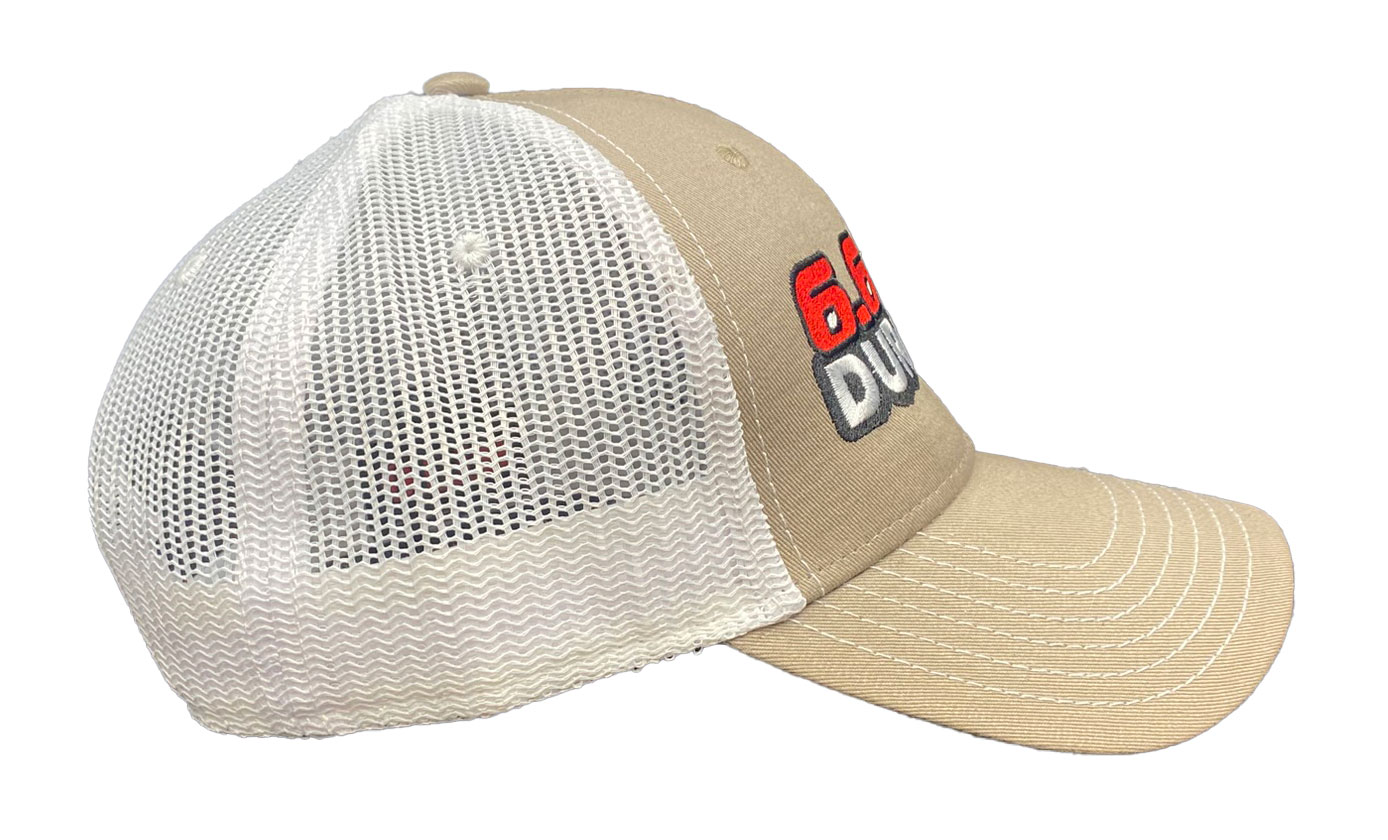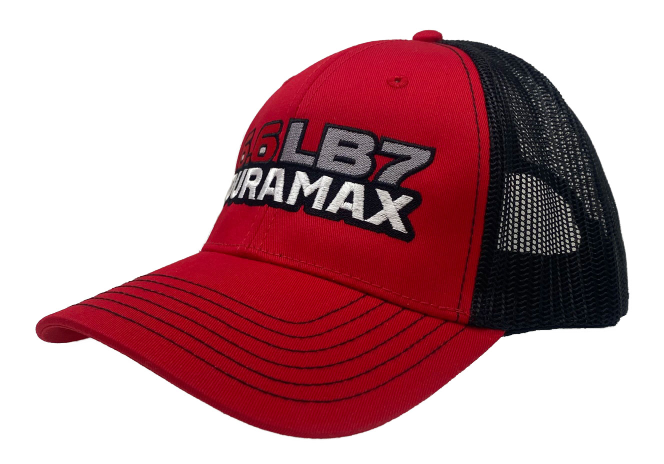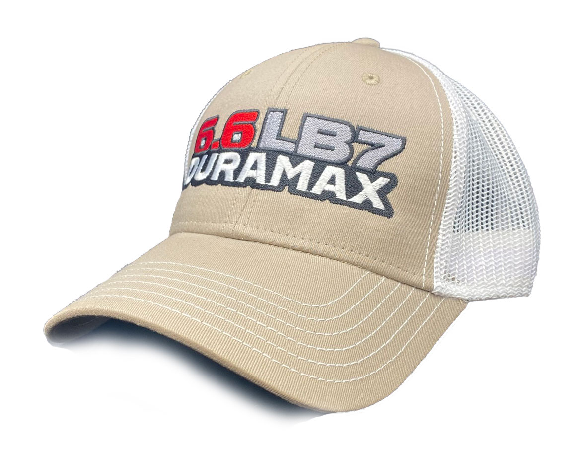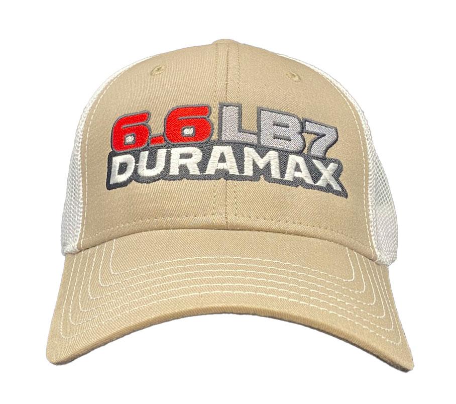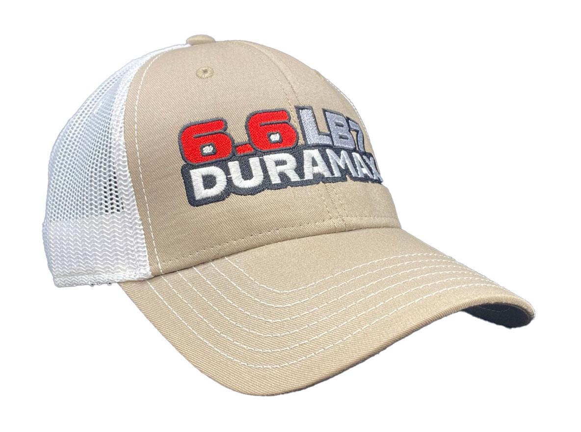 This is a brand new cotton twill low fitting cap with mesh back and adjustable snap band.  Caps is embroidered with 6.6 LB7 Duramax.  Cap features high quality direct embroidered logo.  This is not a patch applique. Choose cap color. Other engine choices are available.