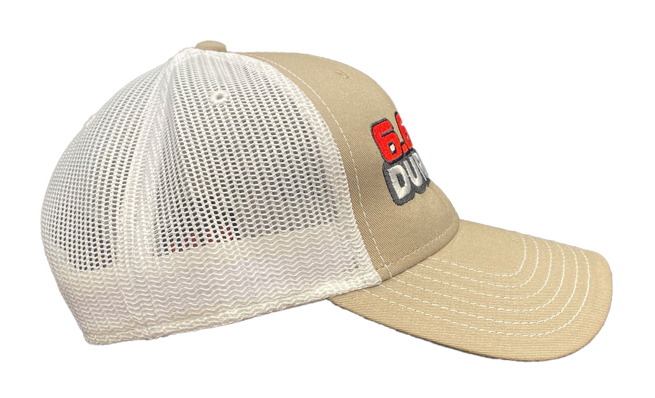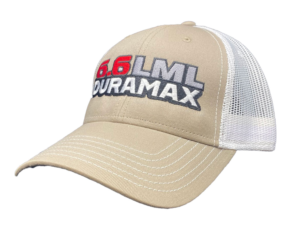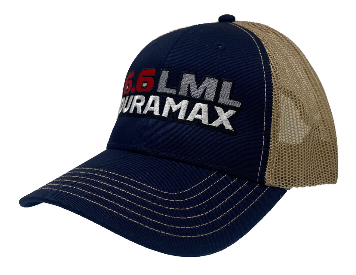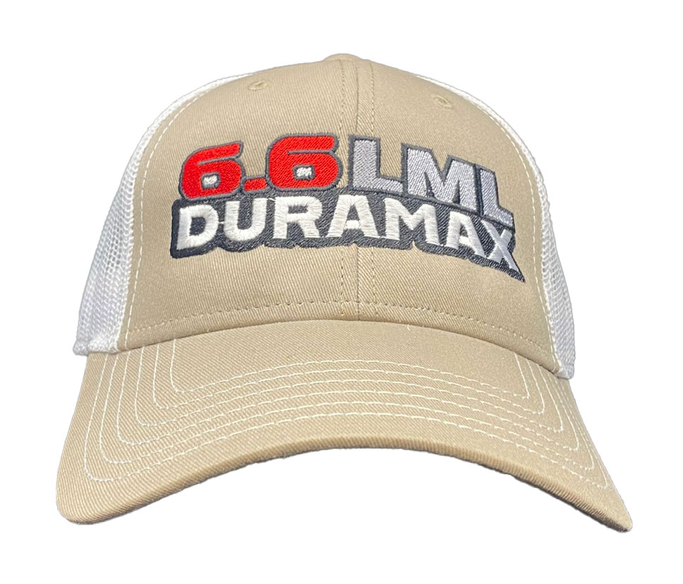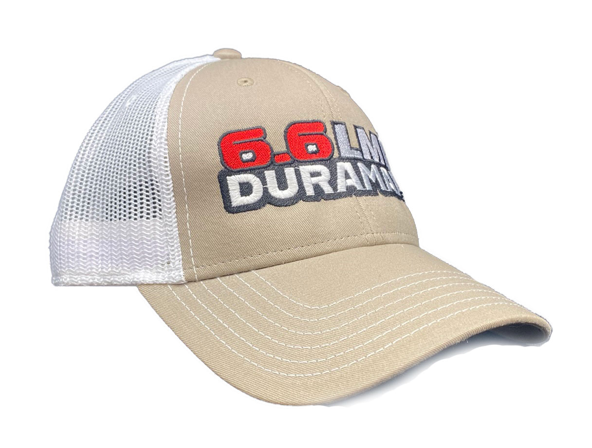 This is a brand new cotton twill low fitting cap with mesh back and adjustable snap band.  Caps is embroidered with 6.6 LML Duramax.  Cap features high quality direct embroidered logo.  This is not a patch applique. Choose cap color. Other engine choices are available.