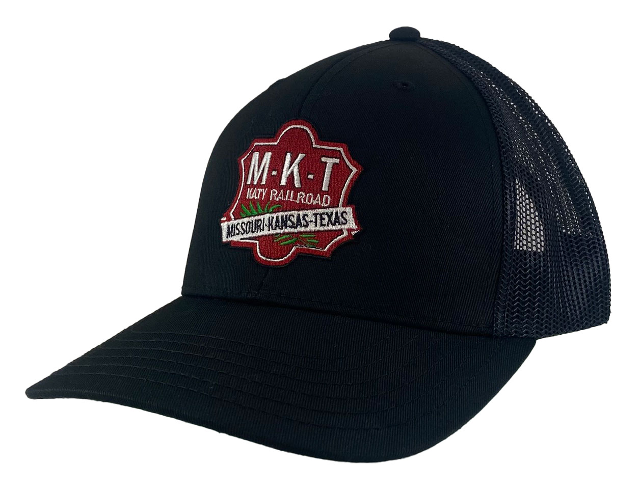 This is a brand new cotton twill cap with adjustable snap band and mesh back. Cap is embroidered with the MKT shield with Missouri-Kansas-Texas Railroad banner.  Cap features high quality direct embroidered logo.  This is not a patch applique.