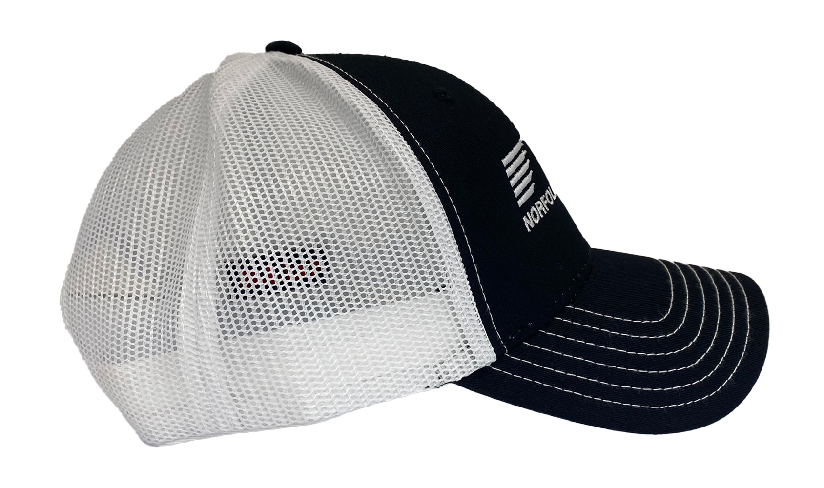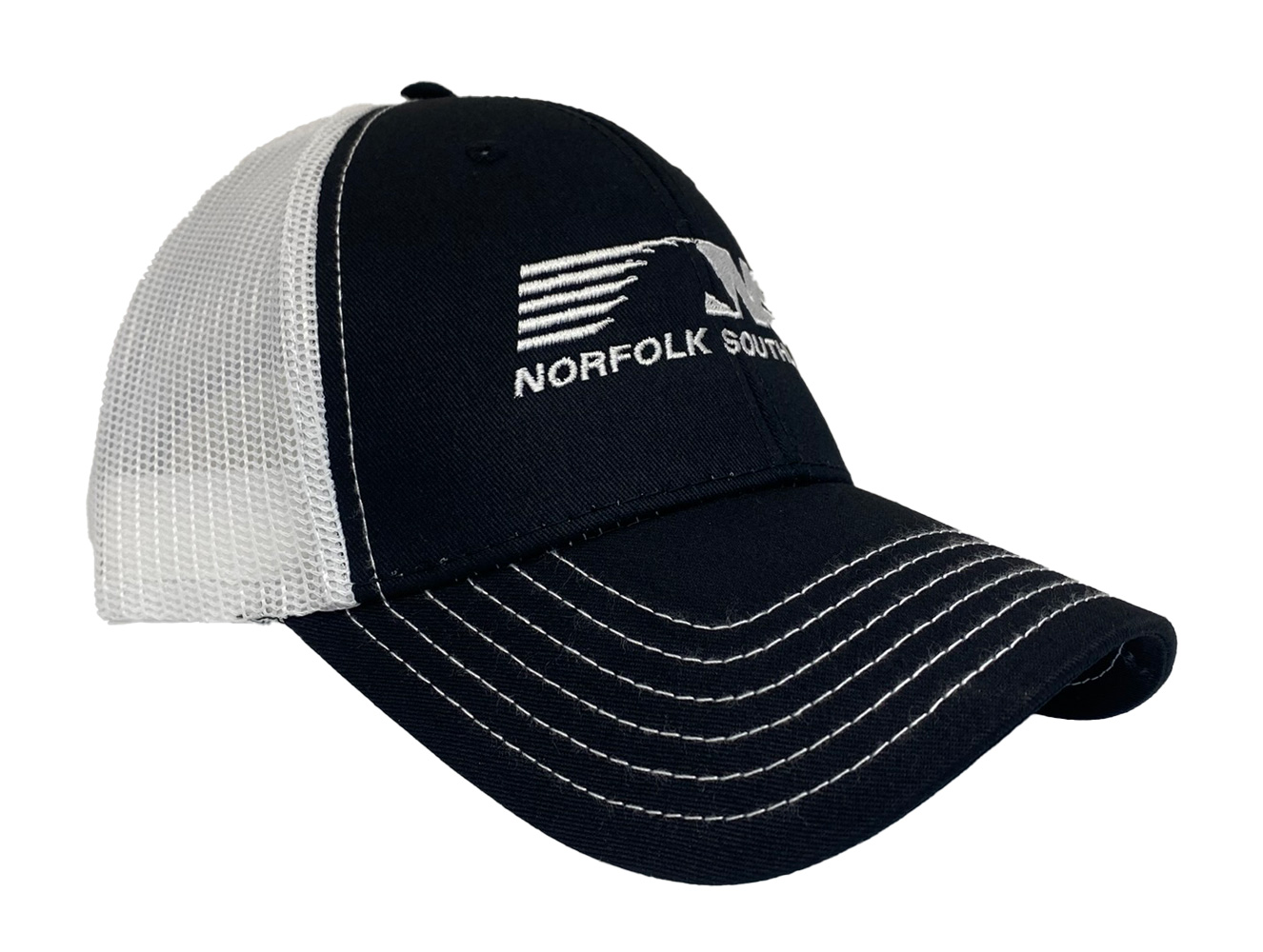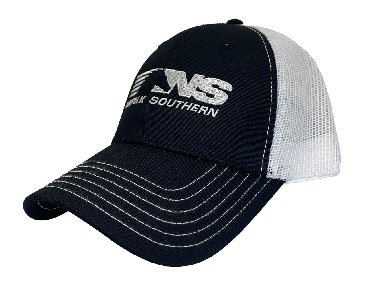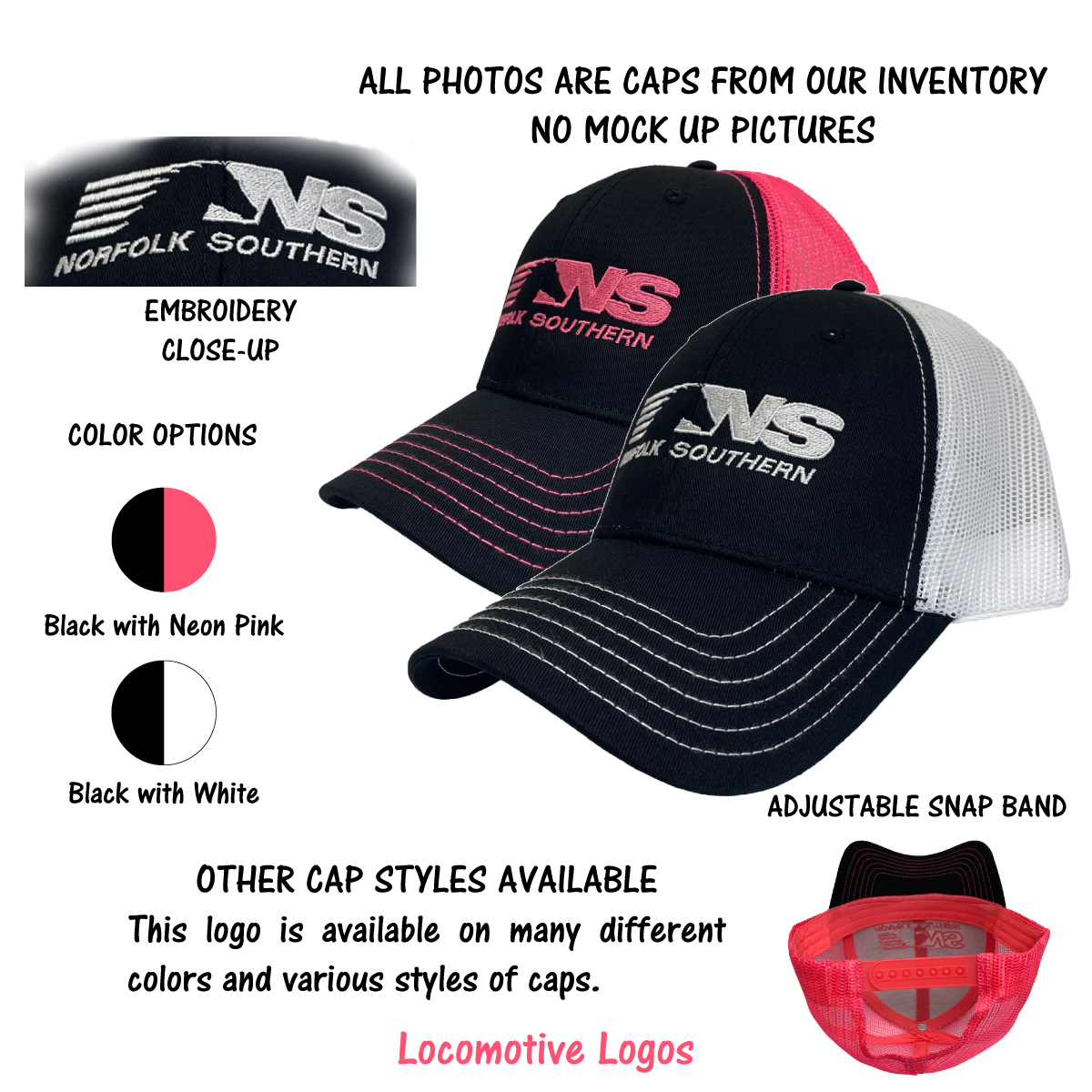 This is a brand new cotton blend twill low fitting cap with mesh back and adjustable snap band. Cap is embroidered with the Norfolk Southern Thoroughbred logo. Cap features high quality direct embroidered logo. This is not a patch applique. Choose color.