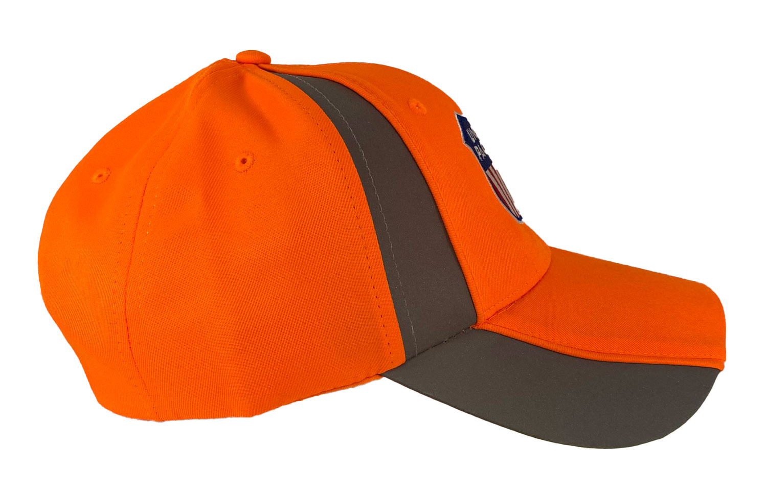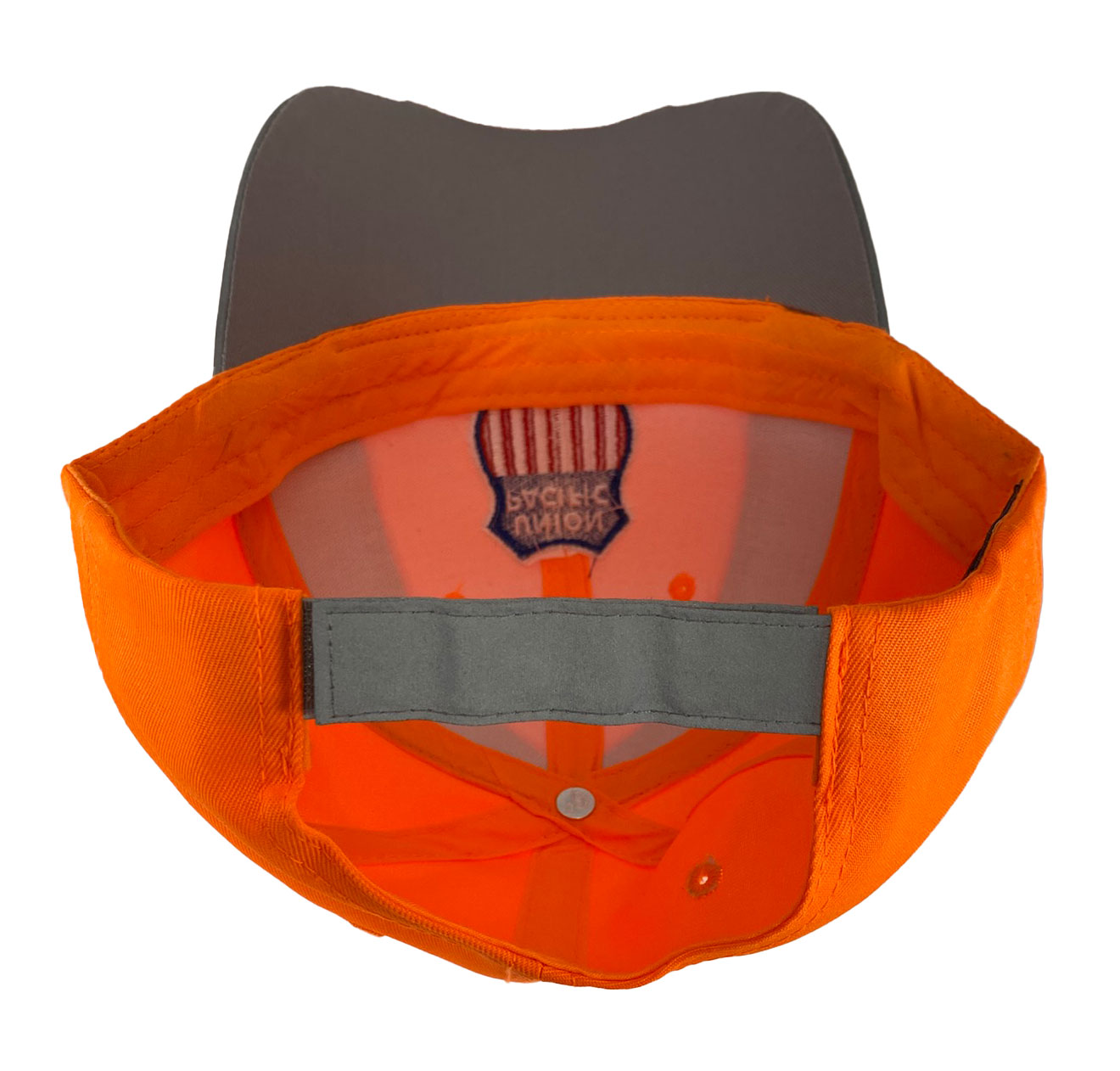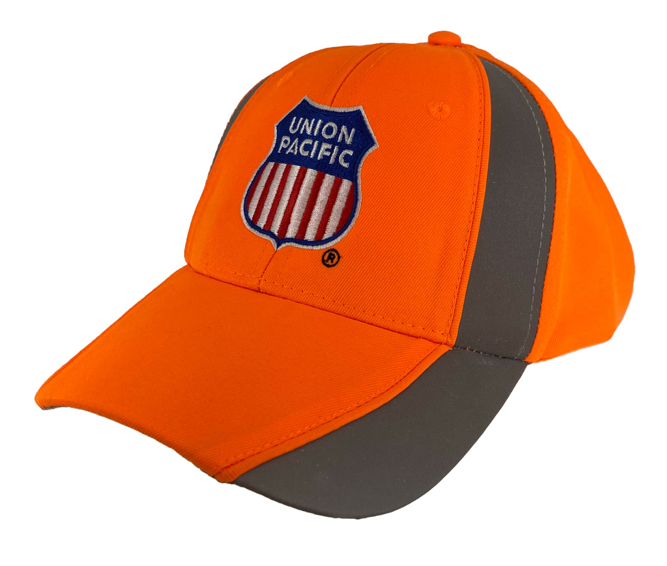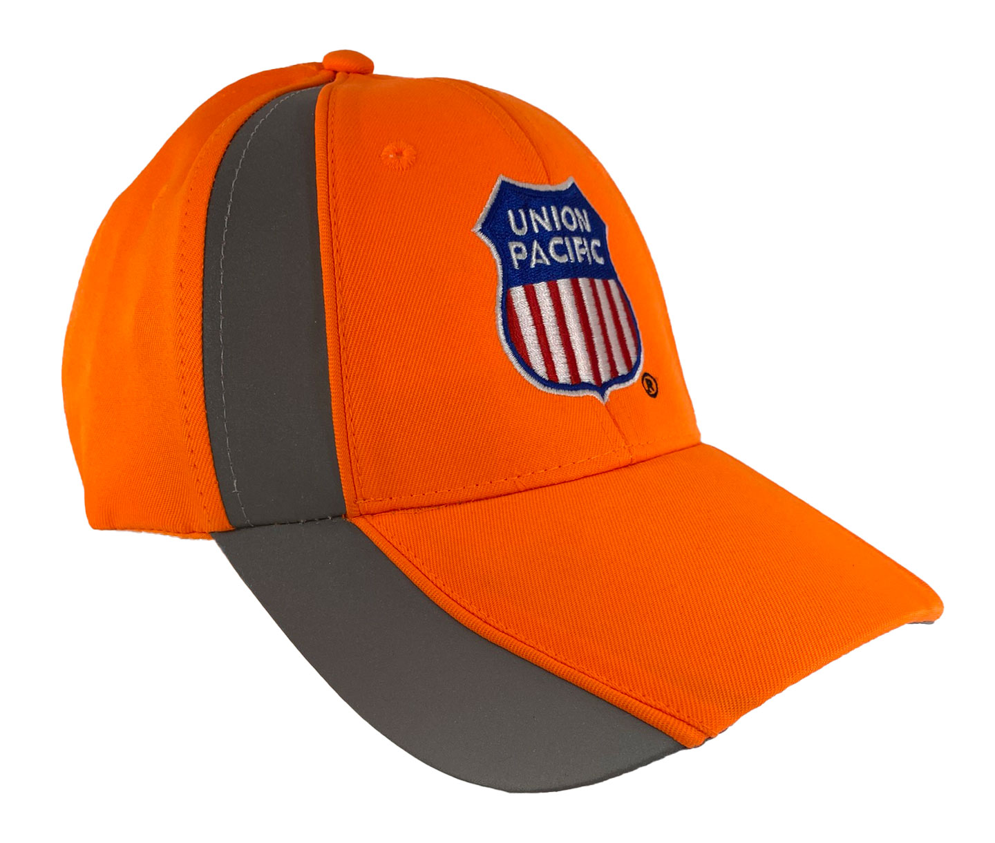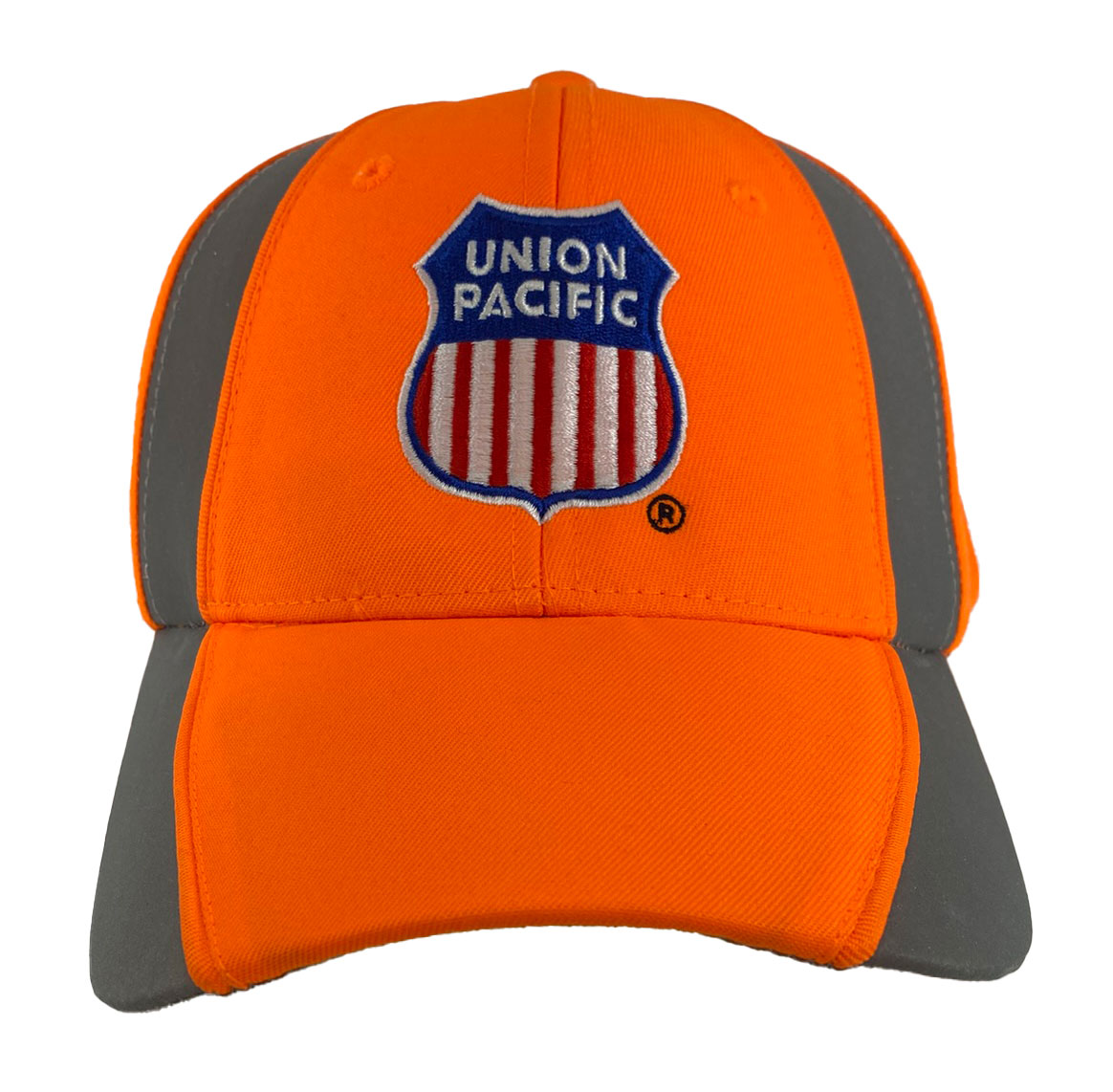 This is a brand new firm front cap with full buckram featuring the Union Pacific shield logo. Cap features high quality direct embroidered logo. This is not a patch applique. Cap has reflective piping and reflective hook and loop closure. Embroidery is NOT reflective. Choose black, neon orange or neon yellow with gray reflective cap.